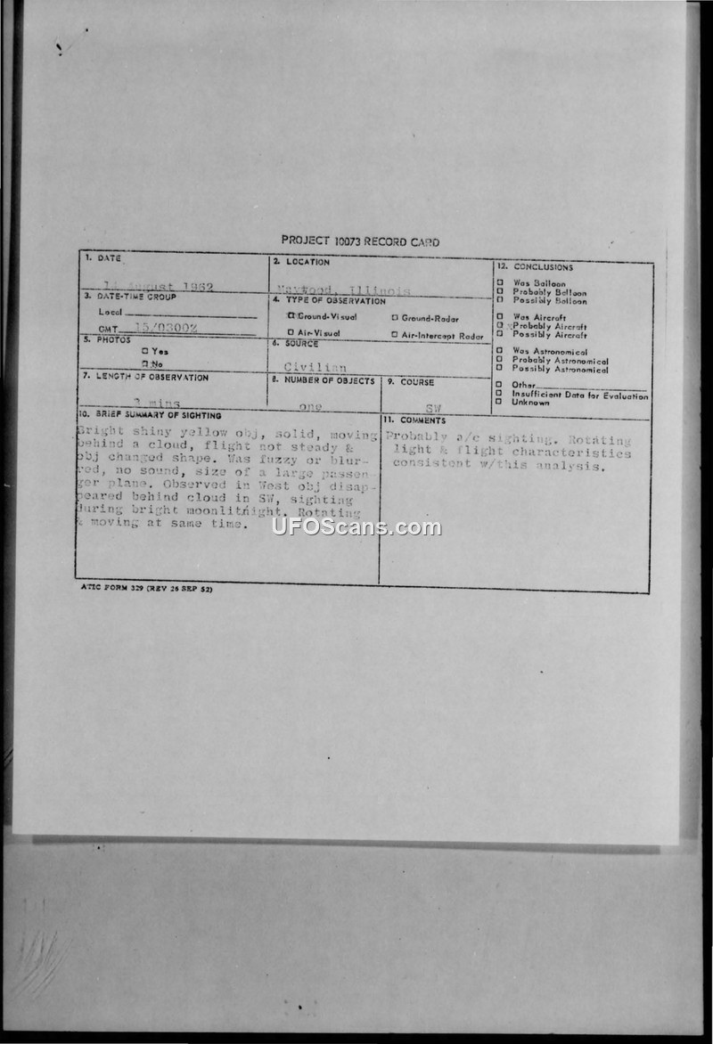 This document is a collection of records, correspondence, and reports related to various UFO sightings in August 1962. The primary record is a Project 10073 Record Card detailing a sighting in Maywood, Illinois, on August 14, 1962. A 12-year-old witness reported seeing a bright, solid, yellow, dish-shaped object that was rotating and moving in an unsteady flight path. The object, which the witness described as being about the size of a passenger plane, was observed for three minutes before disappearing behind a cloud in the west. The official conclusion for this incident was that it was likely an aircraft, with the rotating light and flight characteristics supporting this assessment. The document also contains several other reports and summaries of sightings from various locations, including Argentina, England, and multiple U.S. states. These include accounts of 'mother ships' giving birth to smaller objects, sightings near Titan missile sites in Arizona, and various light phenomena. The file also includes correspondence from the Foreign Technology Division of the U.S. Air Force, acknowledging receipt of reports and requesting further information from witnesses. The collection reflects the Air Force's efforts to document and evaluate these reports during the early 1960s.