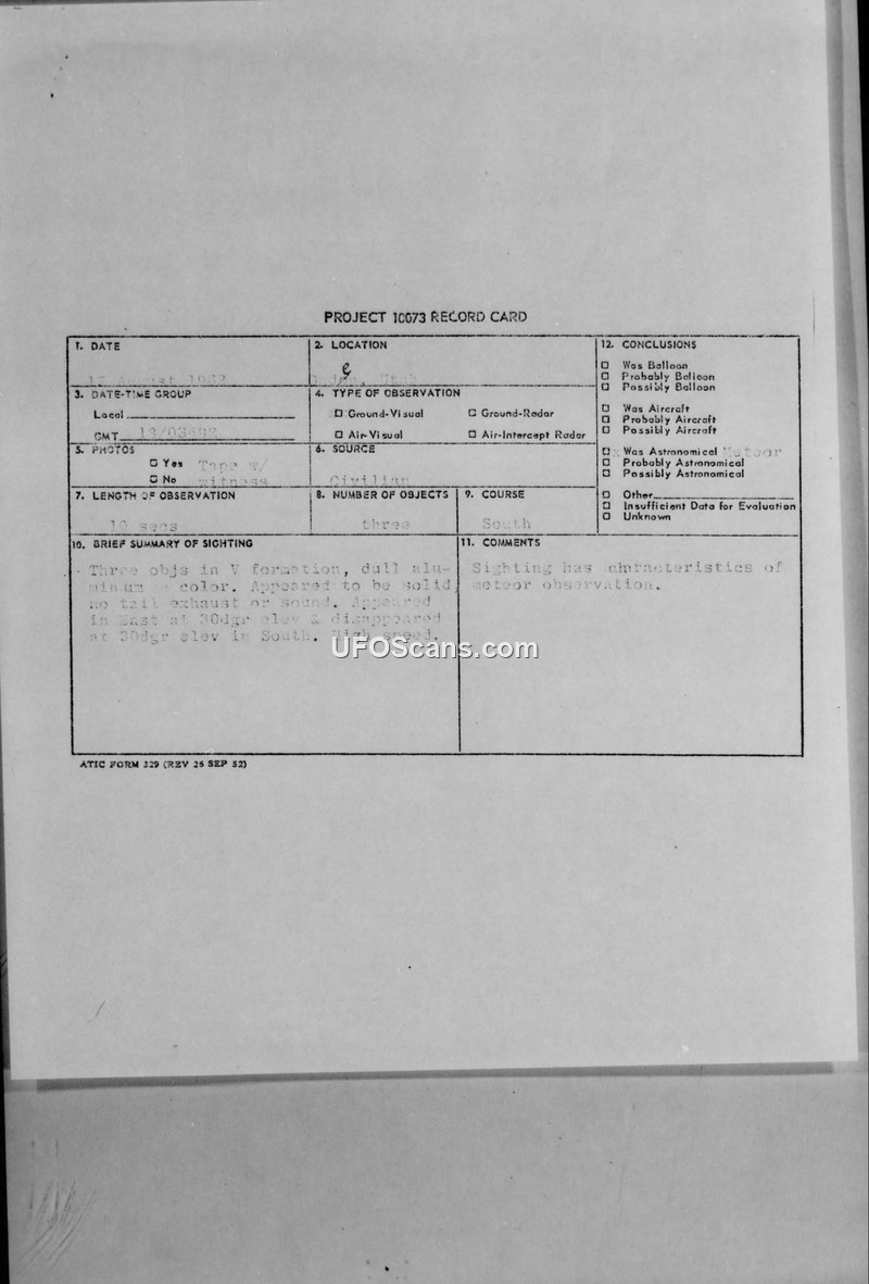 A 1952 sighting report from Ogden, Utah, describes three solid, dull aluminum objects in V formation. The official evaluation concluded the event was a meteor observation.
