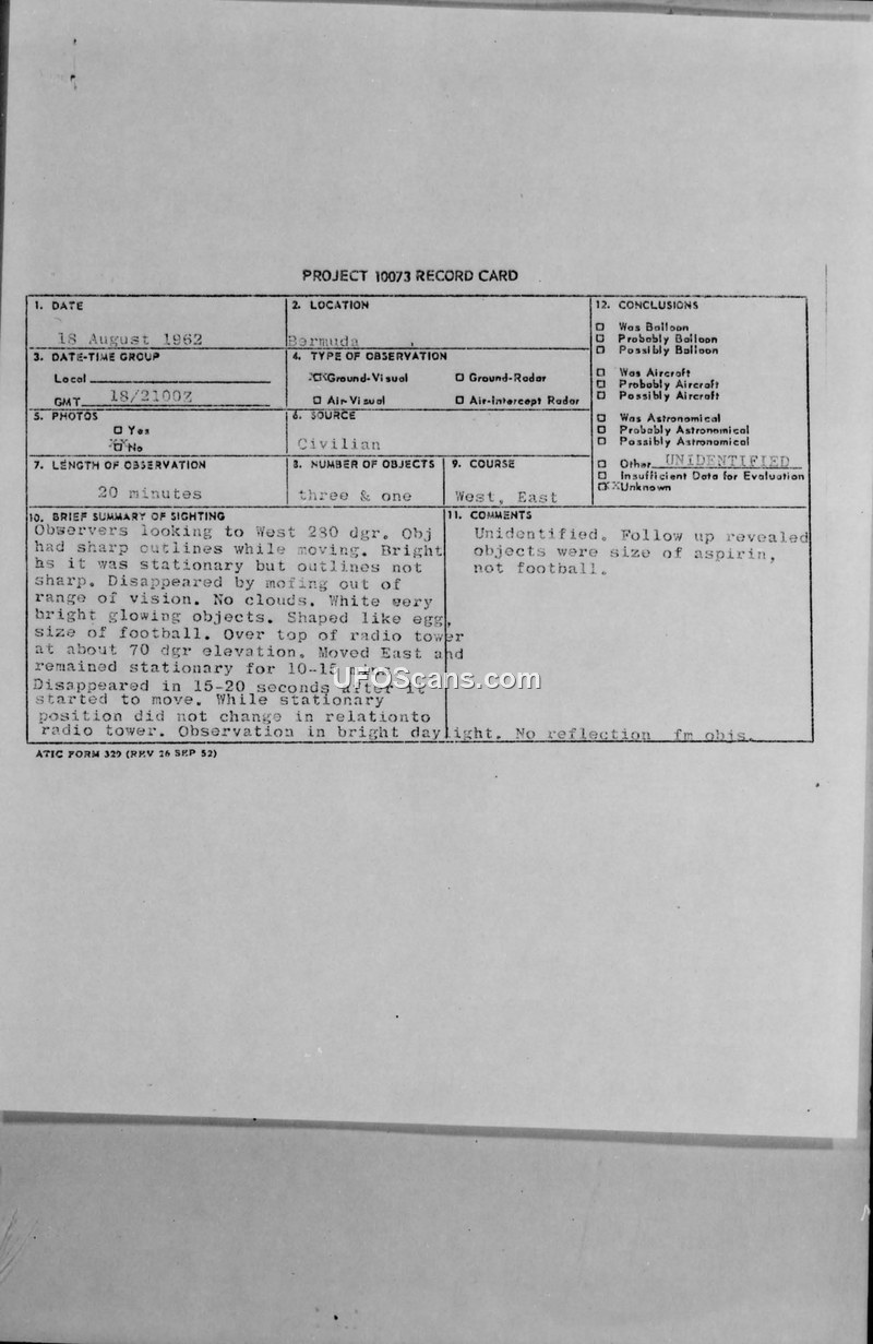 This document consists of a Project 10073 Record Card and a series of military staff messages regarding a UFO sighting in Bermuda on August 18, 1962. The primary witnesses were a radio chief announcer and a radio station owner who were observing a 150-foot radio tower under construction. At approximately 2100Z, they observed a stationary, bright white, egg-shaped object positioned at roughly 70 degrees elevation. The object remained stationary for 10 to 15 minutes before moving East at what was described as 'tremendous speed,' disappearing from view in 15 to 20 seconds. The witnesses noted that the object did not change position relative to the radio tower while stationary. Weather conditions were reported as clear. A follow-up investigation by Major Willard E. Kreidler of the 1604th AB WG confirmed that there were no balloons or other known trajectories in the area that could account for the sighting. In a subsequent message, it was noted that the witness had clarified the size of the object as being comparable to an aspirin, rather than a football as initially reported. A later report added that the same witnesses observed three additional egg-shaped objects moving in a westerly direction, which appeared to waiver as they moved and were not in formation. The investigation remained inconclusive regarding the nature of the objects.