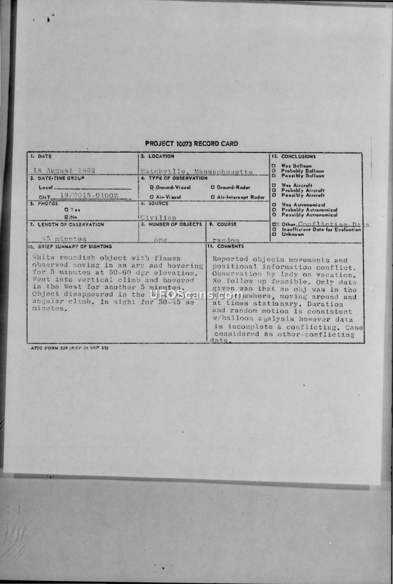 This document consists of a Project 10073 record card and a corresponding Department of the Air Force staff message regarding a UFO sighting that occurred on 19 August 1962 in Hatchville, Massachusetts. The witness, a 35-year-old housewife on vacation, reported observing a roundish, white object with flames. The object was described as hovering at an elevation of 50-60 degrees for five minutes, performing a vertical climb, and then hovering again in the west for another five minutes before disappearing to the north on an angular climb. The total duration of the observation was approximately 45 minutes. The weather conditions were reported as clear with good visibility and no clouds or thunderstorms. Major Keith H. Morehouse of the USAF Chief Intelligence Division noted that there were no known missile firings or radar disturbances related to the event. The official conclusion reached by the Air Force was that the case involved conflicting positional information and data. While the observed motion was noted to be consistent with balloon analysis, the overall data was deemed incomplete and conflicting, leading to the classification of the incident as 'other-conflicting data.' No follow-up investigation was considered feasible.