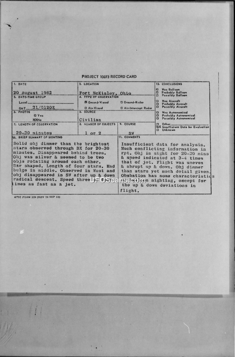 On 20 August 1962, a 16-year-old civilian witness in Fort McKinley, Ohio, observed an unidentified aerial phenomenon for approximately 20 to 30 minutes. The witness described the object as a solid, silver, bar-shaped entity with a bulge in the middle, appearing dimmer than the brightest stars. The witness reported that there were one or two objects that seemed to rotate around each other. The object was initially observed in the West and eventually disappeared in the Southwest after performing a radical descent with abrupt, uneven up-and-down movements. The witness estimated the speed of the object to be three or four times that of a jet. The sighting occurred at night under dry weather conditions with scattered clouds. The witness was outdoors at the time and used binoculars to observe the object. The official Air Force evaluation concluded that there was insufficient data for analysis, noting that while the observation shared some characteristics with a balloon sighting, the reported radical flight deviations and speed were inconsistent with that explanation. The report highlights conflicting information provided by the witness.
