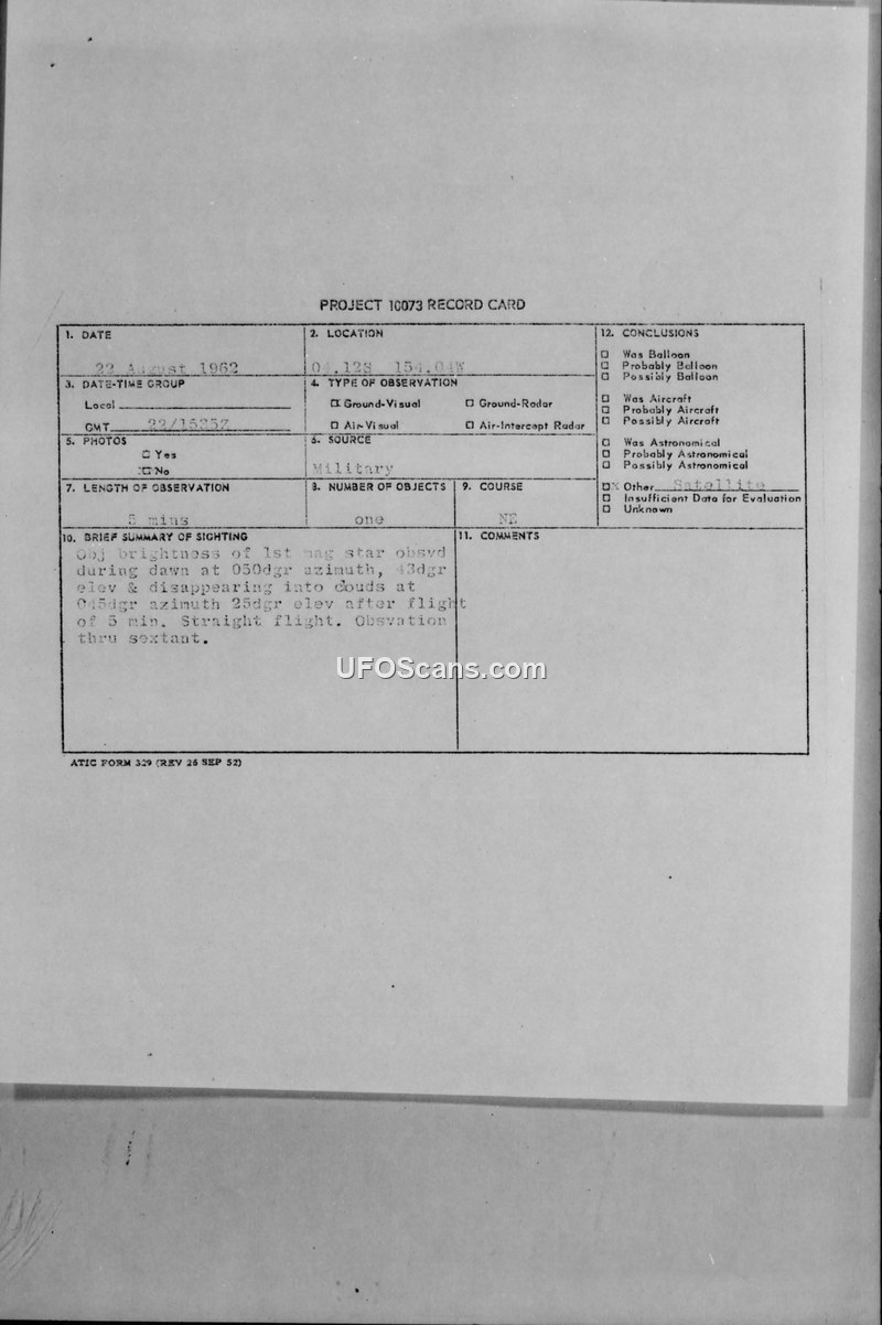 PROJECT 10073 RECORD CARD - Sighting Report 22 August 1962