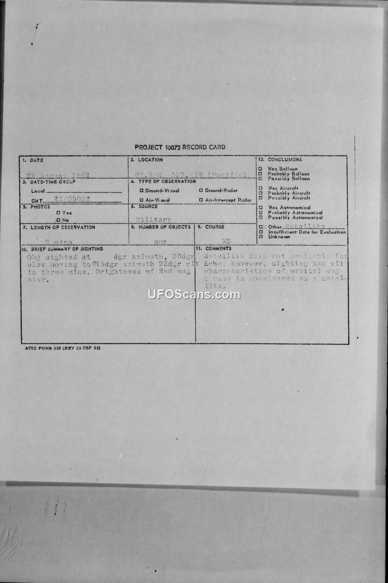 On August 23, 1962, at 0505Z, a sighting of an unidentified aerial object was reported by the USS DURANT in the Pacific region at coordinates 07 degrees 18 minutes South, 153 degrees 41.5 minutes West. The sighting was observed by a lookout, BMSN Davidson, who was noted as being an excellent observer. The object was described as having the brightness of a second-magnitude star. It was observed for a duration of three minutes, moving from an azimuth of 000 degrees true at 30 degrees altitude to an azimuth of 015 degrees true at 25 degrees altitude, with a course toward the northeast. The report was transmitted via naval message to various commands, including CINCPACFLT and HICKAM AFB. The official evaluation, recorded on the Project 10073 record card, concluded that while specific satellite data for the Echo satellite was not available, the object exhibited all the characteristics of an orbital object and was therefore classified as a satellite.