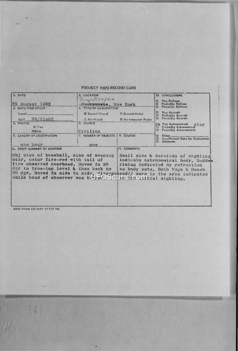 A civilian reported a fire-red, baseball-sized object with a tail in Poughkeepsie, NY, on August 25, 1962. The Air Force concluded the object was an astronomical body, likely the stars Vega or Deneb, affected by atmospheric refraction.