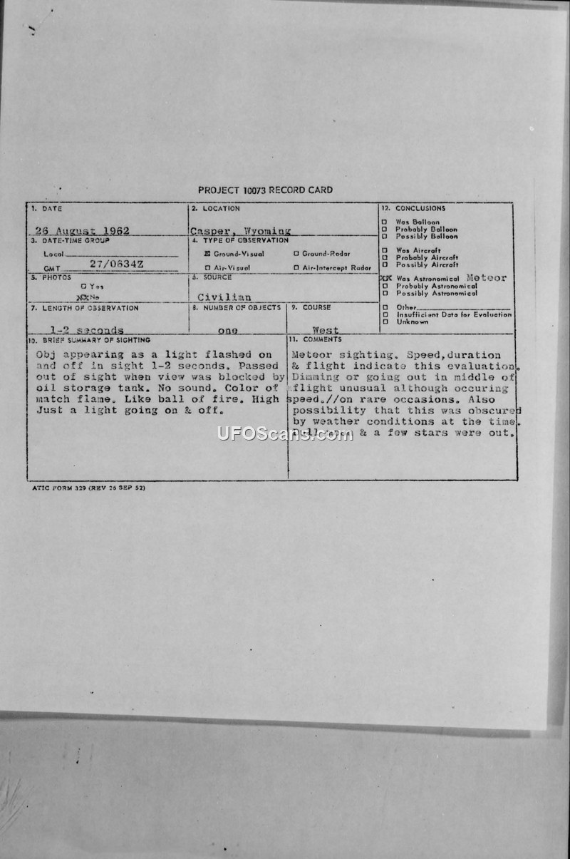 Project 10073 Record Card — Casper, Wyoming, August 26, 1962