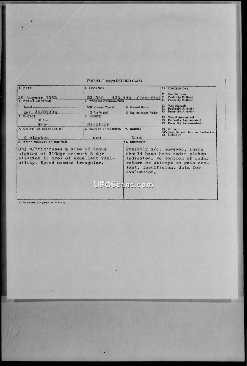 PROJECT 10073 RECORD CARD — 29 August 1962
