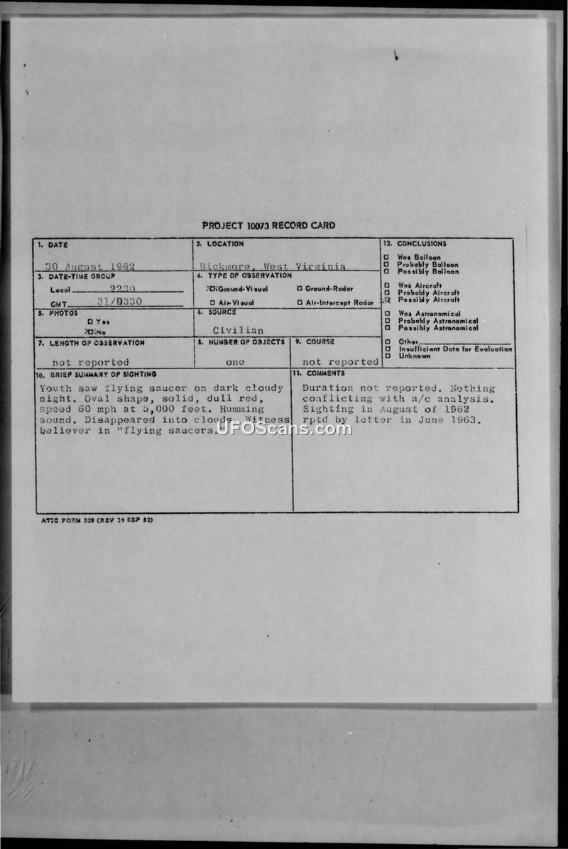 This document is a compilation of records and correspondence related to Project 10073, focusing on Unidentified Aerial Phenomena (UAP) sightings reported in August 1962. The primary record card details a sighting in Bickmore, West Virginia, on August 30, 1962, where a youth observed a solid, dull red, oval-shaped object at 5,000 feet traveling at 60 mph. The object emitted a humming sound and disappeared into clouds. The witness, noted as a believer in 'flying saucers,' reported the event by letter in June 1963. The compilation also includes various other reports from August 1962, including sightings in Norway, Ohio, Argentina, Brazil, and England. Notable reports include a minister in Tipp City, Ohio, observing a bright yellow light on August 17, 1962, and a report from a witness in Philadelphia regarding a 'mother ship' and smaller objects. Another report from Dolores, Argentina, mentions a photograph taken of a brightly-lit UFO on the ground near National Highway Two. The document also contains a list of sightings from September 1-5, 1962, categorized by location and evaluation, with some identified as 'slag' or 'cinder' and others marked as 'insufficient data.' A handwritten note on one page, addressed to the Office of Wm P. Bundy, requests further investigation into sightings in Canada. The overall tone of the correspondence reflects public frustration with official explanations, such as 'temperature inversions' or 'optical illusions,' with witnesses demanding the truth about the nature of these objects.