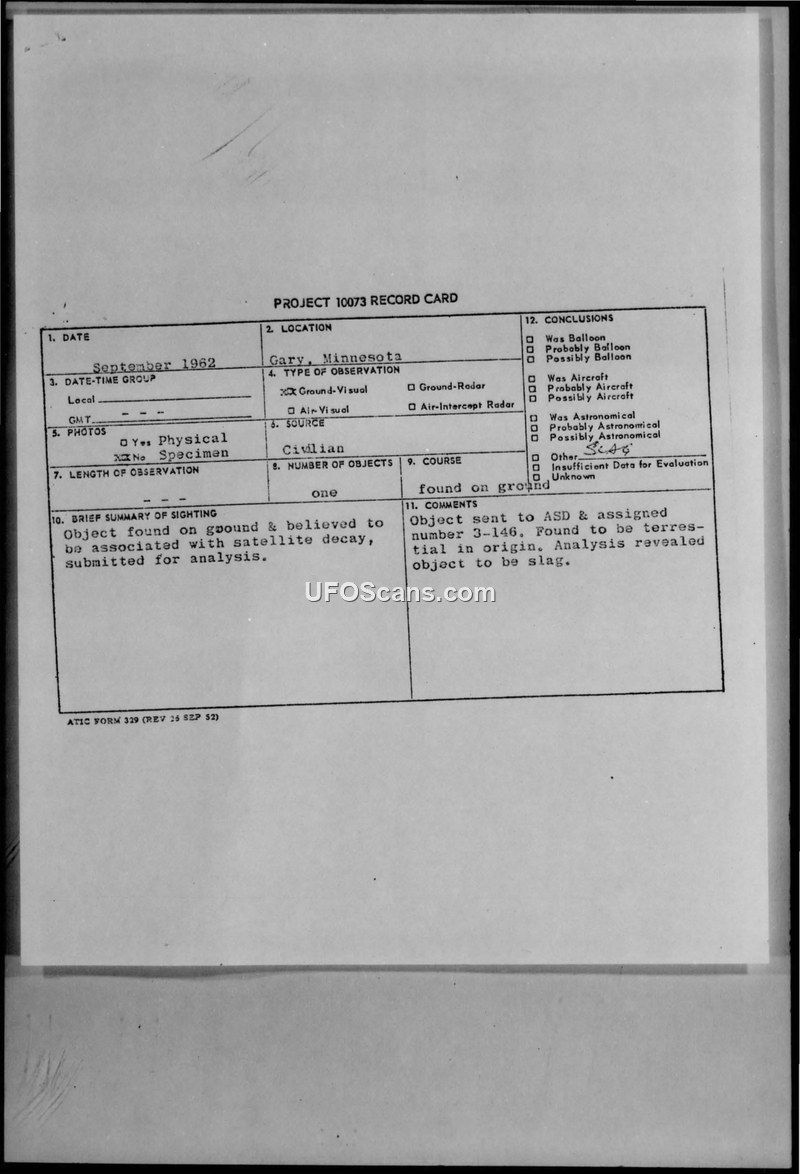 This document details the investigation of a rock sample found in Gary, Minnesota, in September 1962. A civilian resident reported that the object appeared in his yard, and he suspected it might be associated with satellite decay, noting the timing coincided with reports of Russian Sputnik pieces falling in Wisconsin. The sample was forwarded to Wright-Patterson Air Force Base for identification. The object was assigned control number 3-146 and subjected to chemical and physical examination by the Aeronautical Systems Division (ASD). The final analysis, dated February 8, 1963, concluded that the sample was terrestrial in origin and identified it as slag, which is common in regions of past glacial activity. The report confirms that the object was not related to any extraterrestrial or satellite-related phenomena.