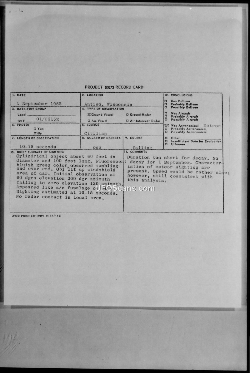 On 1 September 1962, at approximately 0615Z, an insurance salesman observed a cylindrical object in the vicinity of Antigo, Wisconsin. The witness described the object as being 60 feet in diameter and 100 feet in length, possessing a fluorescent bluish-green color. The object was observed tumbling end-over-end and appeared to resemble an aircraft fuselage on fire. The sighting lasted between 10 and 15 seconds, during which the object's light illuminated the windshield of the witness's vehicle. The object was observed falling from an initial position of 60 degrees elevation at 300 degrees azimuth to zero elevation at 120 degrees azimuth. The report was submitted to the Foreign Technology Division at Wright-Patterson Air Force Base by the Sault Ste Marie Air Defense Sector in accordance with AFR 200-2. Local radar at Antigo, Wisconsin, reported no tracks in the area. The official conclusion reached by the evaluating agency was that the object was an astronomical event, specifically a meteor, noting that while the duration was short for decay, the characteristics were consistent with such a phenomenon. The report was delayed by over a week before reaching the intelligence officer, J.G. Cucheran of the RCAF.