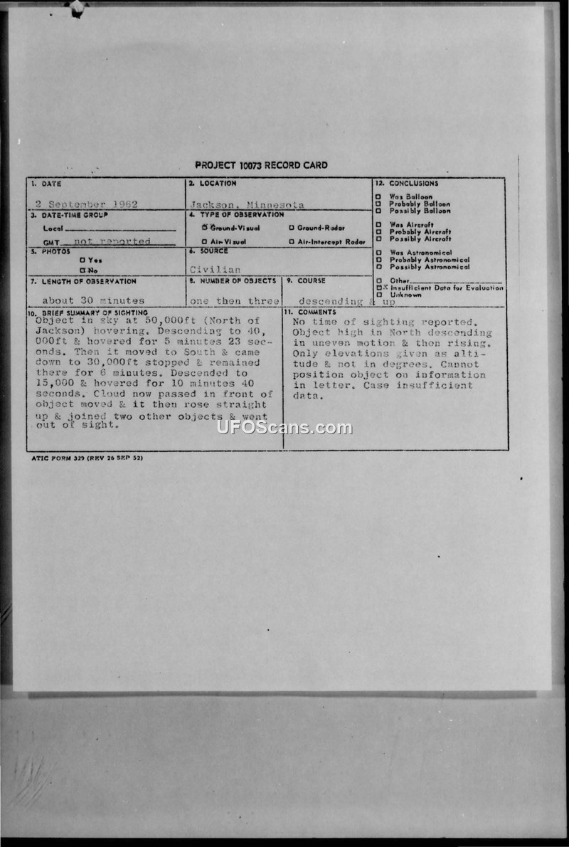 Project 10073 Record Card — Jackson, Minnesota, 2 September 1962