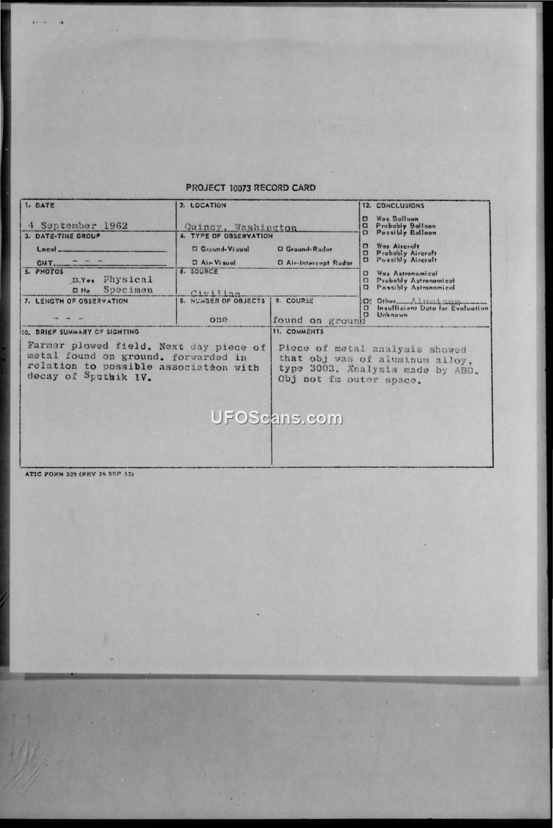 This document collection details the recovery and analysis of metal fragments found in various locations across the United States in September 1962, which were initially reported as Unidentified Aerial Phenomena (UAP). The primary incident involves a farmer in Quincy, Washington, who discovered a piece of metal in his field on 4 September 1962. This was subsequently forwarded to the Air Force for analysis. Other reports in the file describe sightings of flaming objects in the sky over Wisconsin and North Dakota, involving multiple witnesses, including airline pilots and military personnel. The Air Force investigation, conducted under Project 10073, consistently concluded that these sightings and the recovered debris were associated with the decay and atmospheric re-entry of the Soviet satellite Sputnik IV. Laboratory analysis of the recovered fragments, including the piece from Washington and others from Wisconsin, identified them as aluminum alloy or alloy steel, consistent with man-made satellite construction rather than extraterrestrial origin. The documents include official record cards, correspondence between military units such as the 4170th Strategic Wing and the Air Technical Intelligence Center (ATIC), and press clippings discussing the recovery of the fragments and the subsequent diplomatic interactions at the United Nations regarding the debris.