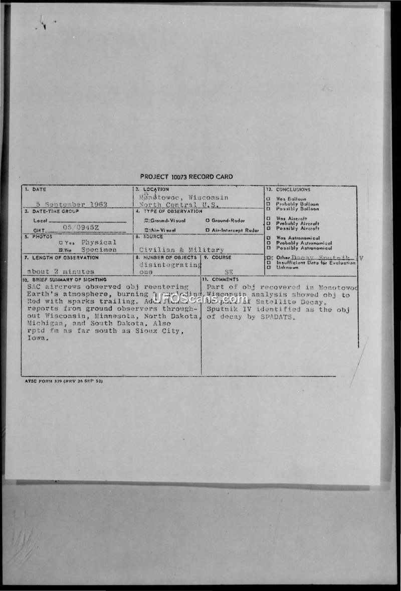 This document details the 5 September 1962 sighting of the re-entering Soviet satellite Sputnik IV over the North Central U.S. It confirms the event was a satellite decay and notes the subsequent recovery of debris in Wisconsin and Washington.