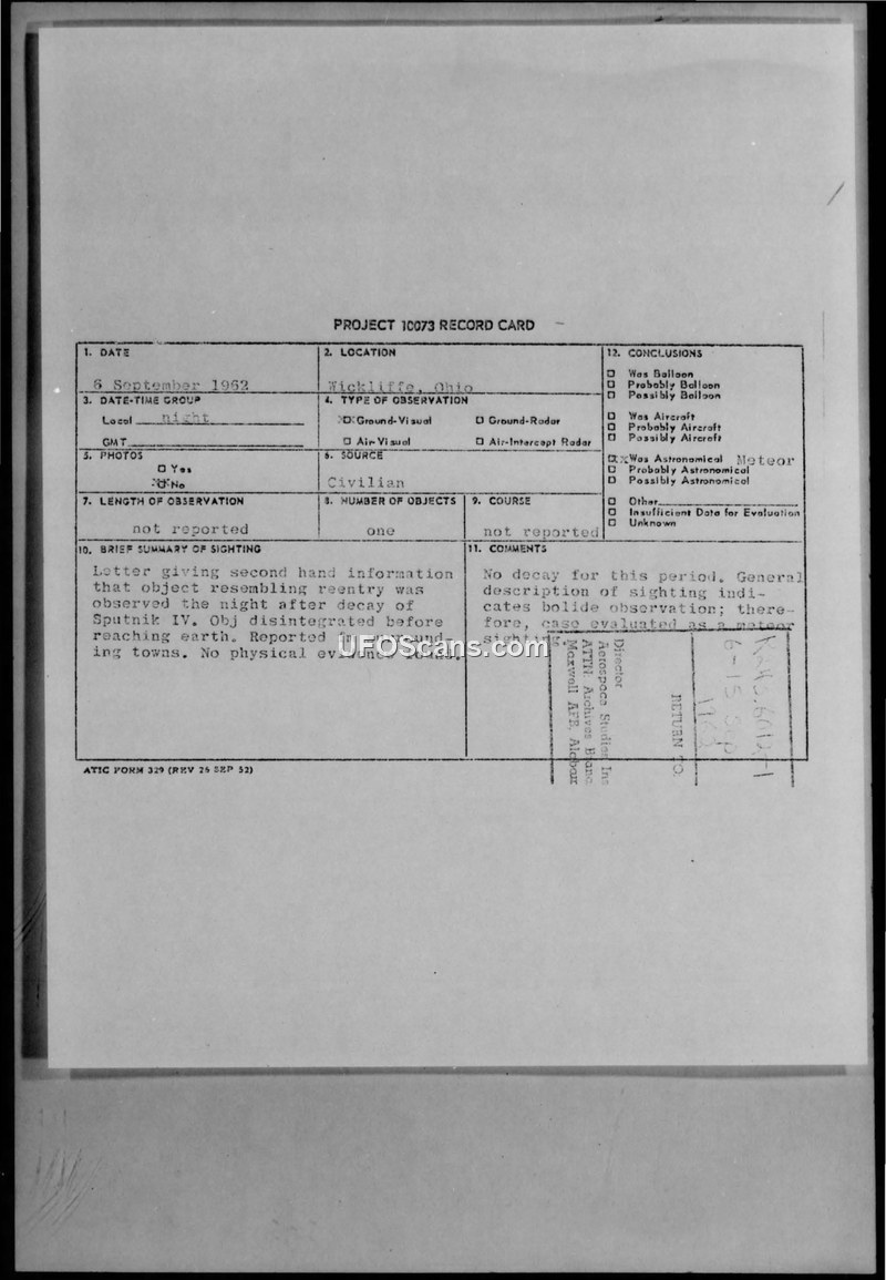 A 1962 inquiry regarding a cone-shaped object seen over Wickliffe, Ohio, was investigated by the Air Force under Project 10073. The military concluded the sighting was a meteor (bolide) rather than the re-entry of the Sputnik IV satellite.