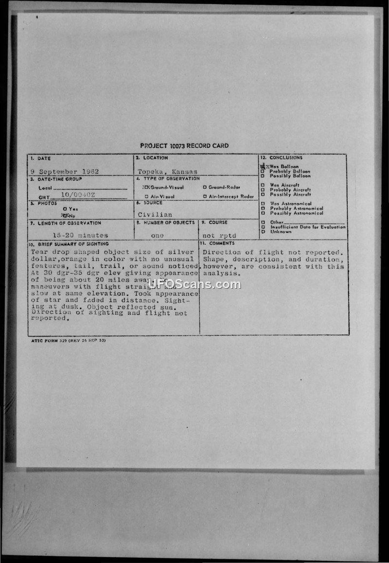 Project 10073 Record Card — Topeka, Kansas, 9 September 1962
