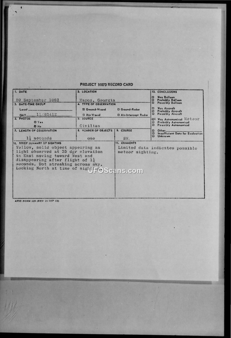 A civilian in Macon, Georgia, reported a 1.25-second sighting of a yellow, solid object streaking across the sky on September 10, 1962. The Air Force concluded the object was likely a meteor.