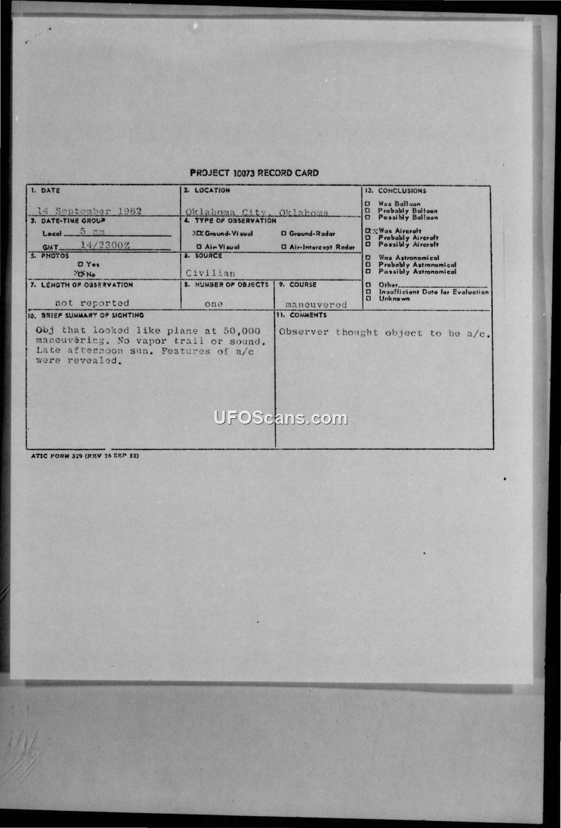 Project 10073 Record Card — Oklahoma City, Oklahoma, 14 September 1962