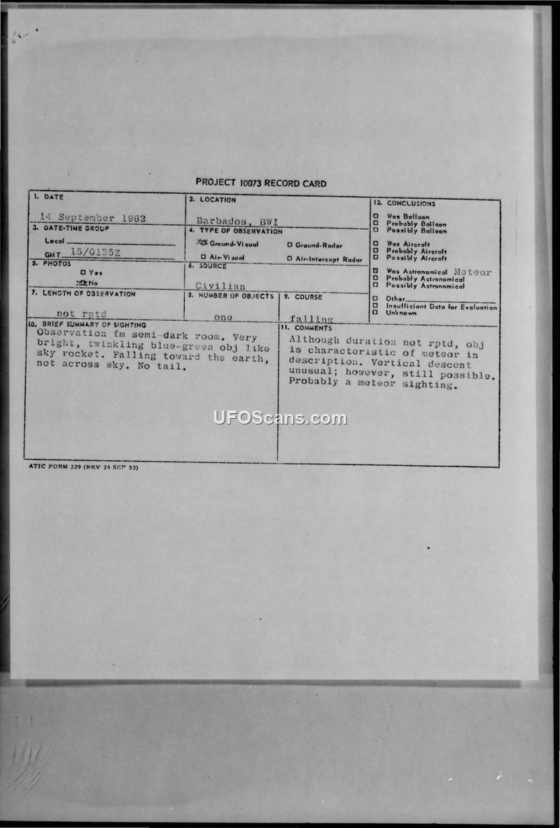 This document collection contains records regarding two distinct UFO-related inquiries handled by the United States Air Force in late 1962. The first part of the file concerns a sighting reported in Barbados on September 14, 1962. A civilian witness observed a very bright, twinkling blue-green object that appeared to fall vertically toward the earth, similar to a firework skyrocket but without a tail. The witness, writing to the North American Air Defense Command, noted the object did not move across the sky. The official conclusion recorded on the Project 10073 record card was that the event was likely a meteor sighting, noting that while the vertical descent was unusual, it remained a plausible explanation. The second part of the file documents an investigation into a resident of Steelville, Missouri, who had reported numerous sightings of 'big green balls' flying at tree-top level. The investigation, conducted by the 12th District Office of Special Investigations, involved interviews with local residents, including the local postmaster. The investigation concluded that the witness's reports were likely a product of her imagination, potentially influenced by her husband's past health issues and her own mental state, which the investigators deemed impaired. Consequently, the Air Force decided not to conduct further interviews with the witness regarding her claims.