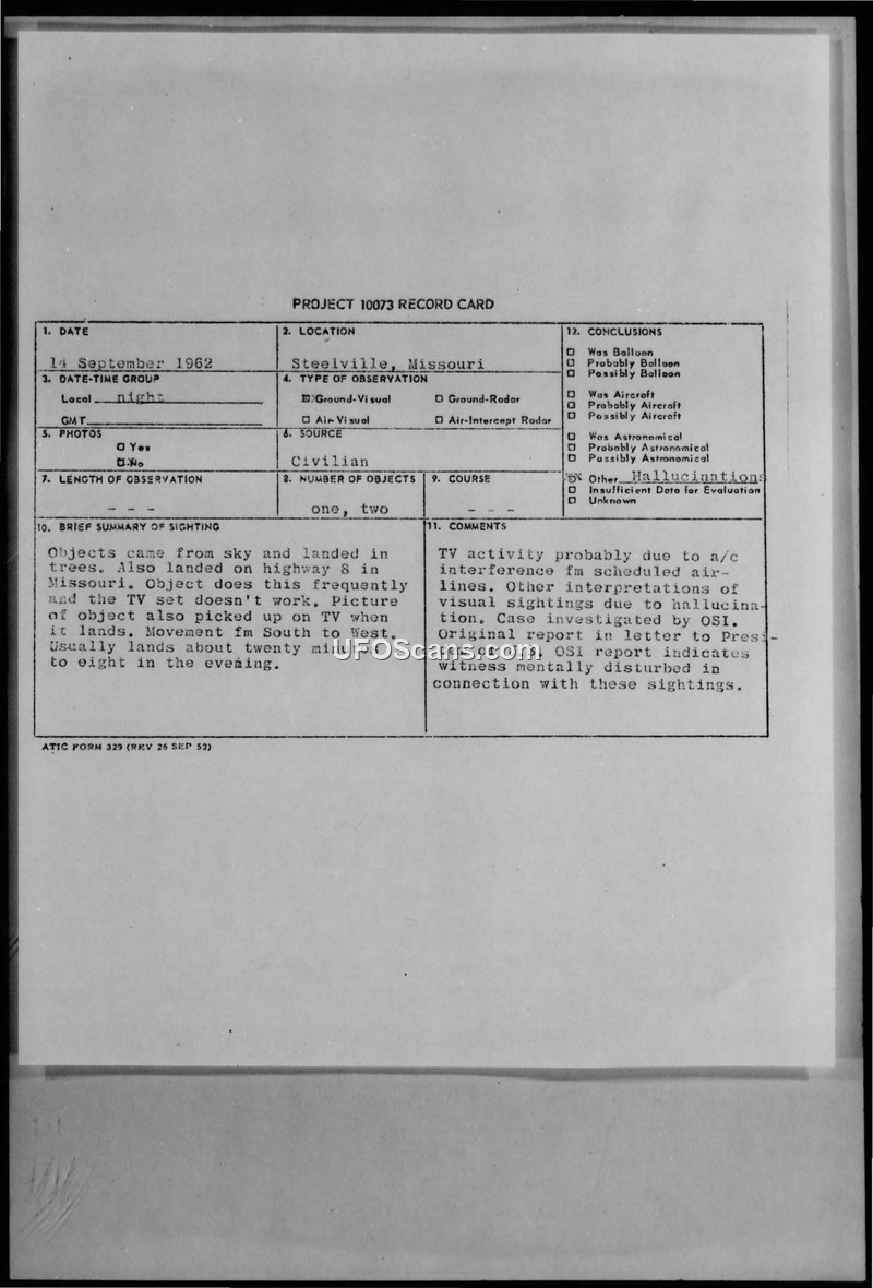 A civilian reported UFO sightings and TV interference in Steelville, Missouri, in 1962. The Air Force investigated and concluded the sightings were hallucinations and the TV issues were caused by aircraft interference.