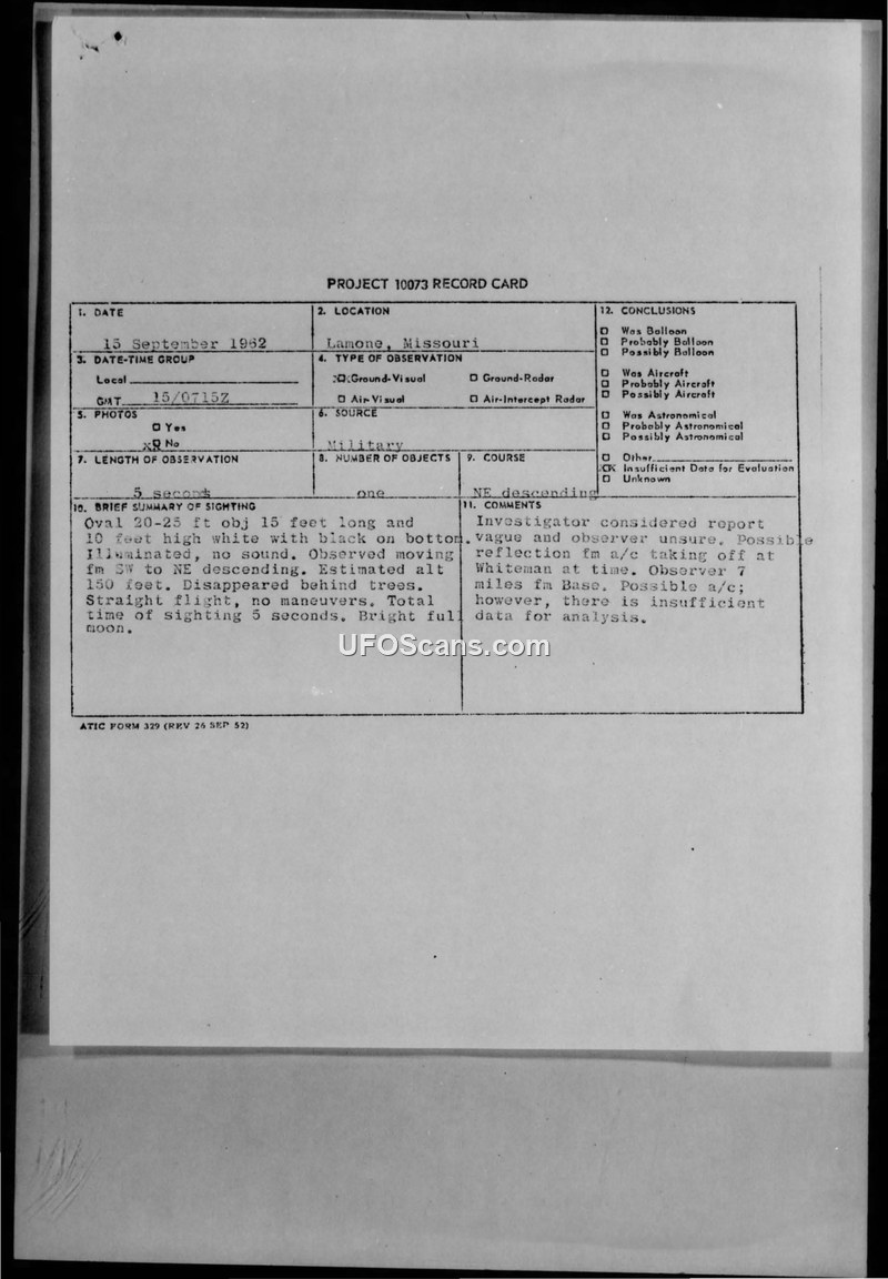 Project 10073 Record Card and Incoming Message — Lamone, Missouri, 15 September 1962