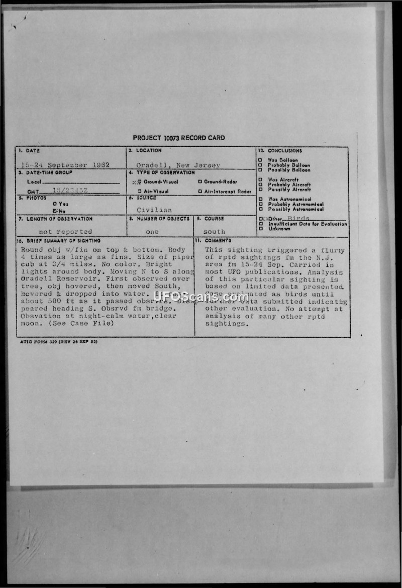 This document archive details a series of UFO sightings centered around the Oradell Reservoir in New Jersey, beginning on September 15, 1962. Three boys reported seeing a round object with fins on the top and bottom, approximately the size of a Piper Cub, hovering over the reservoir before dropping into the water and subsequently rising to an altitude of 500 feet. The object then disappeared heading south. The incident triggered a significant public reaction, leading to a 'flurry' of reported sightings in the region throughout the following week. Local police, including the Oradell and Haworth departments, were involved in the initial investigation, and the Air Force was notified. The Foreign Technology Division (FTD) of the Air Force Systems Command evaluated the report, concluding that the limited data provided by the witnesses made a definitive identification impossible, but suggested that a bird was the most logical explanation. The FTD noted that the angular size of the object, if it were a bird at a distance of 150 feet, would match the angular size reported by the witnesses. The archive includes various documents, including a Project 10073 record card, police investigation reports, correspondence between the Air Force and the public, and press clippings from 'Saucer News' and other sources. These materials highlight the tension between public interest, media coverage, and official military assessment. While the Air Force maintained a skeptical stance, citing the potential for misidentification, the local community and various witnesses remained convinced of the unusual nature of the events, with reports of banana-shaped tracks in nearby Emerson and sightings of strange aerial objects by multiple witnesses, including police officers.