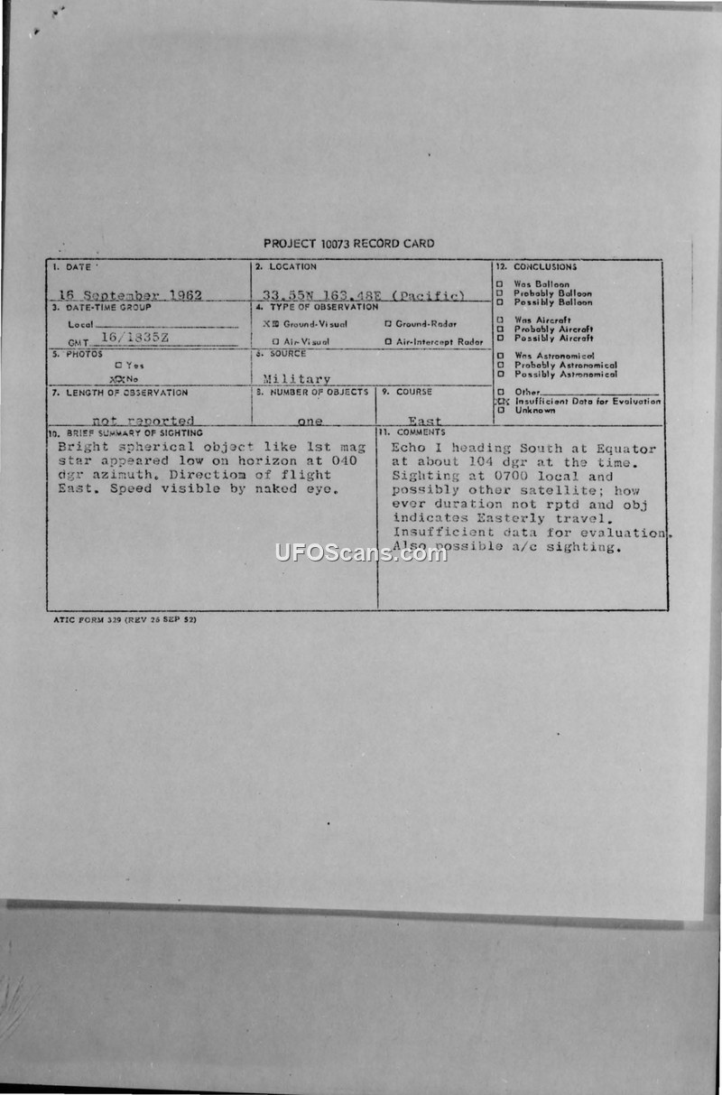 This document consists of a Project 10073 record card and an associated incoming military message regarding an unidentified aerial phenomenon observed on September 16, 1962. The sighting occurred in the Pacific region at coordinates 33.5N 163.48E. The witness described a bright, spherical object, comparable in size to a first-magnitude star, appearing low on the horizon at a 040-degree azimuth. The object was observed moving East and was visible to the naked eye. Weather conditions were reported as clear with 7/10 cloud coverage and good visibility. Military evaluators noted that the Echo I satellite was heading South at the equator at approximately 104 degrees at the time of the sighting. Due to the lack of reported duration and the object's indicated Easterly travel, the official conclusion was that there was insufficient data for a definitive evaluation, though the possibility of an aircraft sighting was also noted.