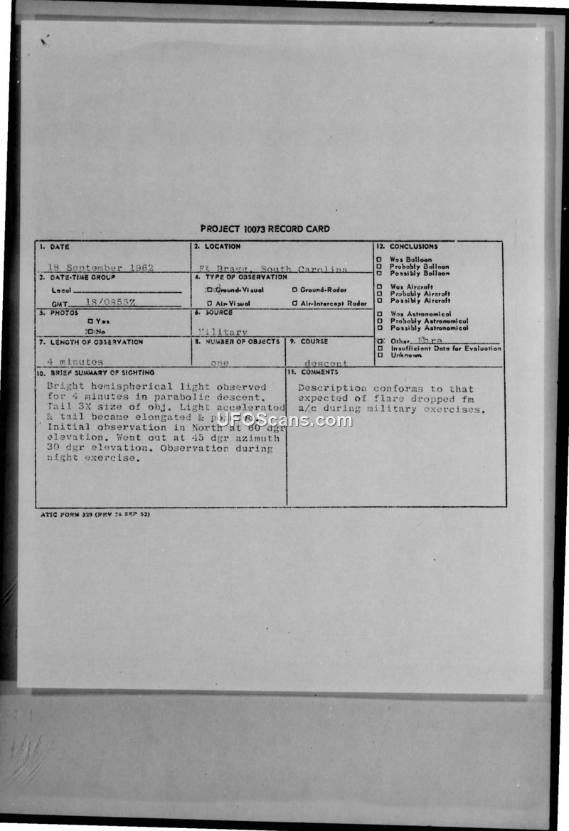 On September 18, 1962, at 0855Z, a sighting of an unidentified aerial phenomenon occurred near Fort Bragg, South Carolina. The primary witness was 1st Lieutenant Gene I. Basel, a pilot with the 352nd Tactical Fighter Squadron, who was accompanied by five other military personnel during a night exercise. The witness observed a bright, hemispherical white light for approximately four minutes. The object was described as being roughly the size of a penny held at arm's length. During the observation, the object performed a parabolic descent, during which it accelerated and developed an elongated, pointed tail that was three times the size of the object itself. The initial observation was made at 60 degrees elevation, and the object eventually disappeared at 45 degrees azimuth and 30 degrees elevation. The witness noted that the light stopped moving as if it had burned up. Weather conditions at the time were reported as high thin scattered clouds with excellent visibility. The official conclusion reached by the Air Technical Intelligence Center (ATIC) was that the description of the object was consistent with a flare dropped from an aircraft during military exercises.