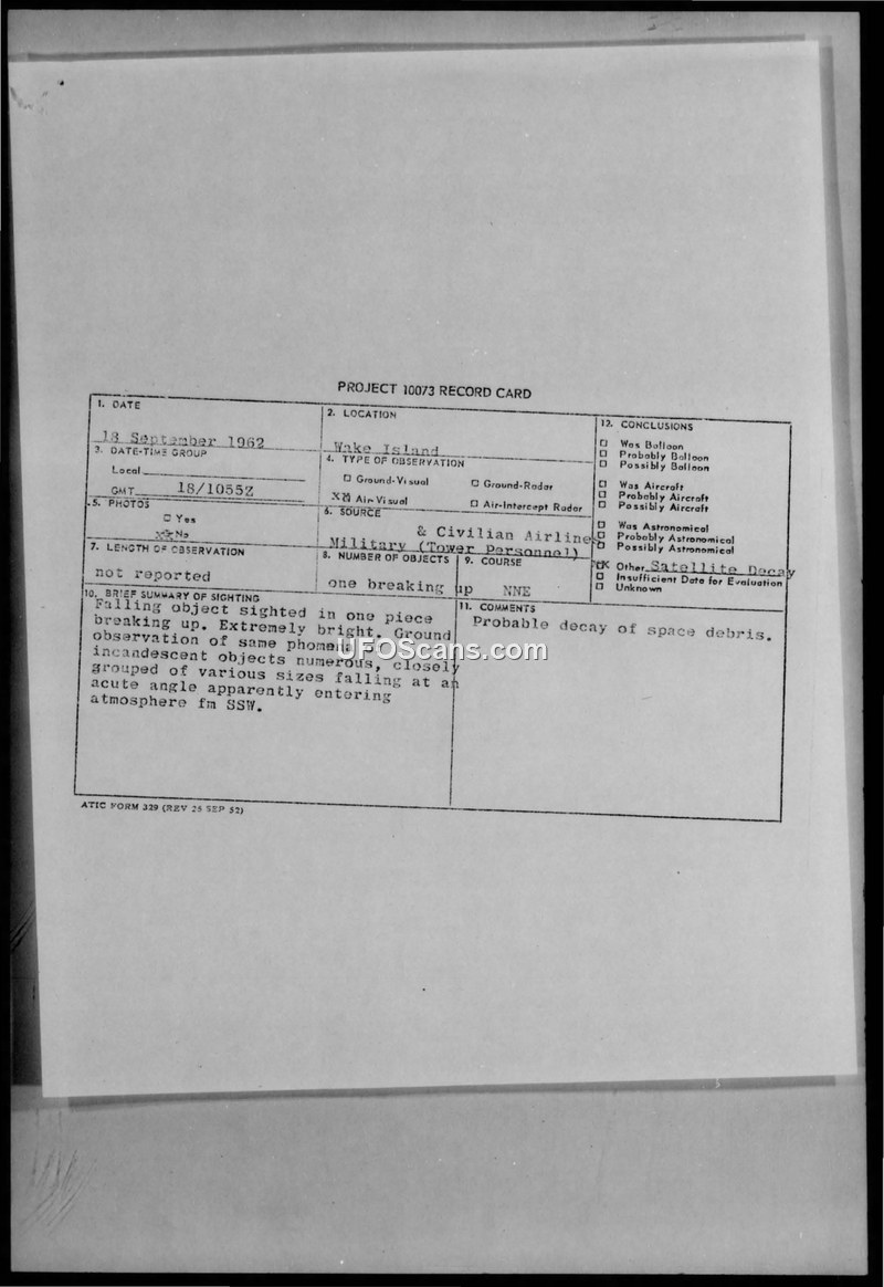 Project 10073 Record Card: Wake Island Sighting, 18 September 1962
