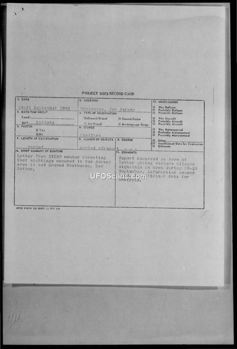 Project 10073 Record Card and Correspondence Regarding Hawthorne, New Jersey Sightings