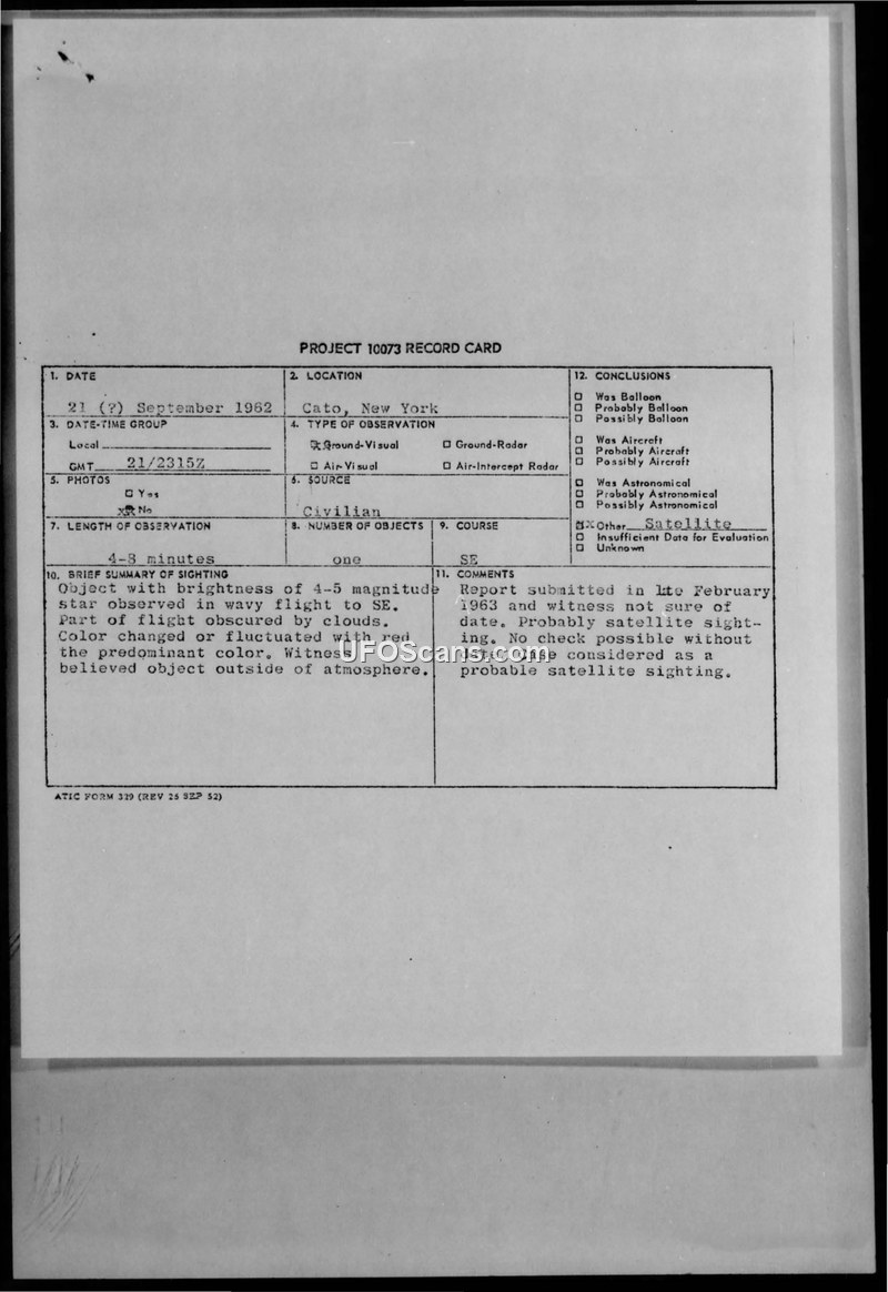 A 14-year-old witness in Cato, New York, reported a 4-8 minute sighting of a bright, red-fluctuating object in September 1962. The Air Force concluded the object was likely a satellite, with the observed motion attributed to atmospheric conditions.