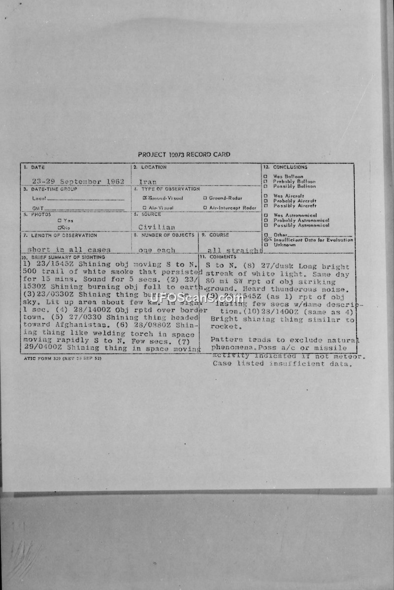 PROJECT 10073 RECORD CARD - Iran Sighting Reports 1962
