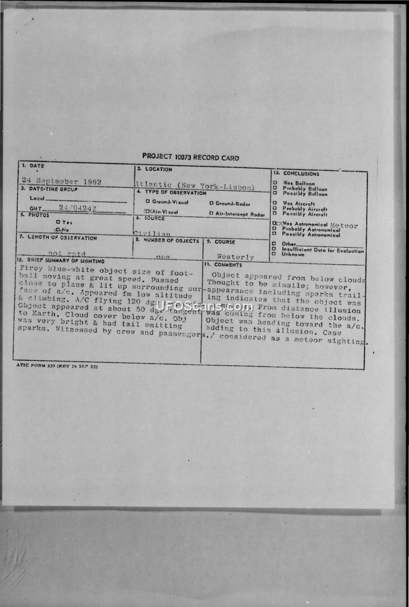 A TWA pilot reported a bright, blue-white object with a sparking tail while flying over the Atlantic on 24 September 1962. Military authorities investigated the report and concluded the object was a meteor.