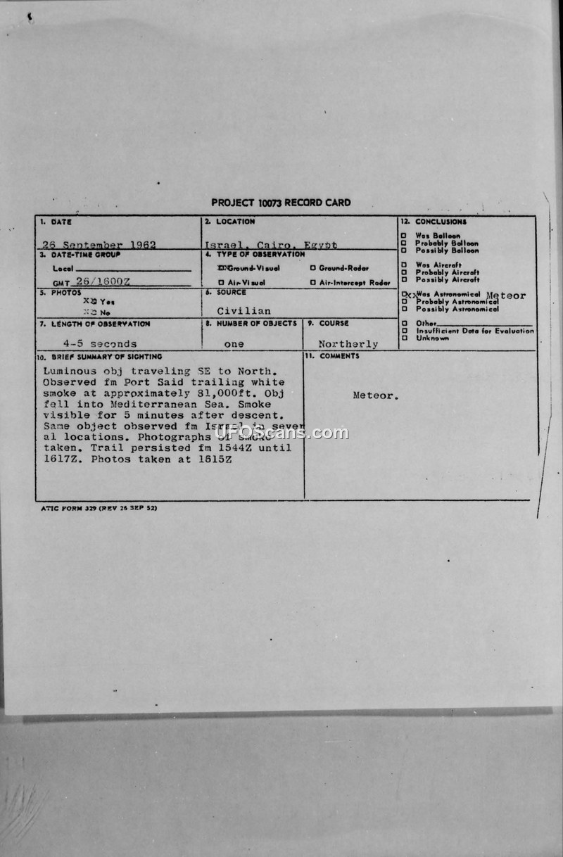 Project 10073 Record Card — Israel, Cairo, Egypt, 26 September 1962