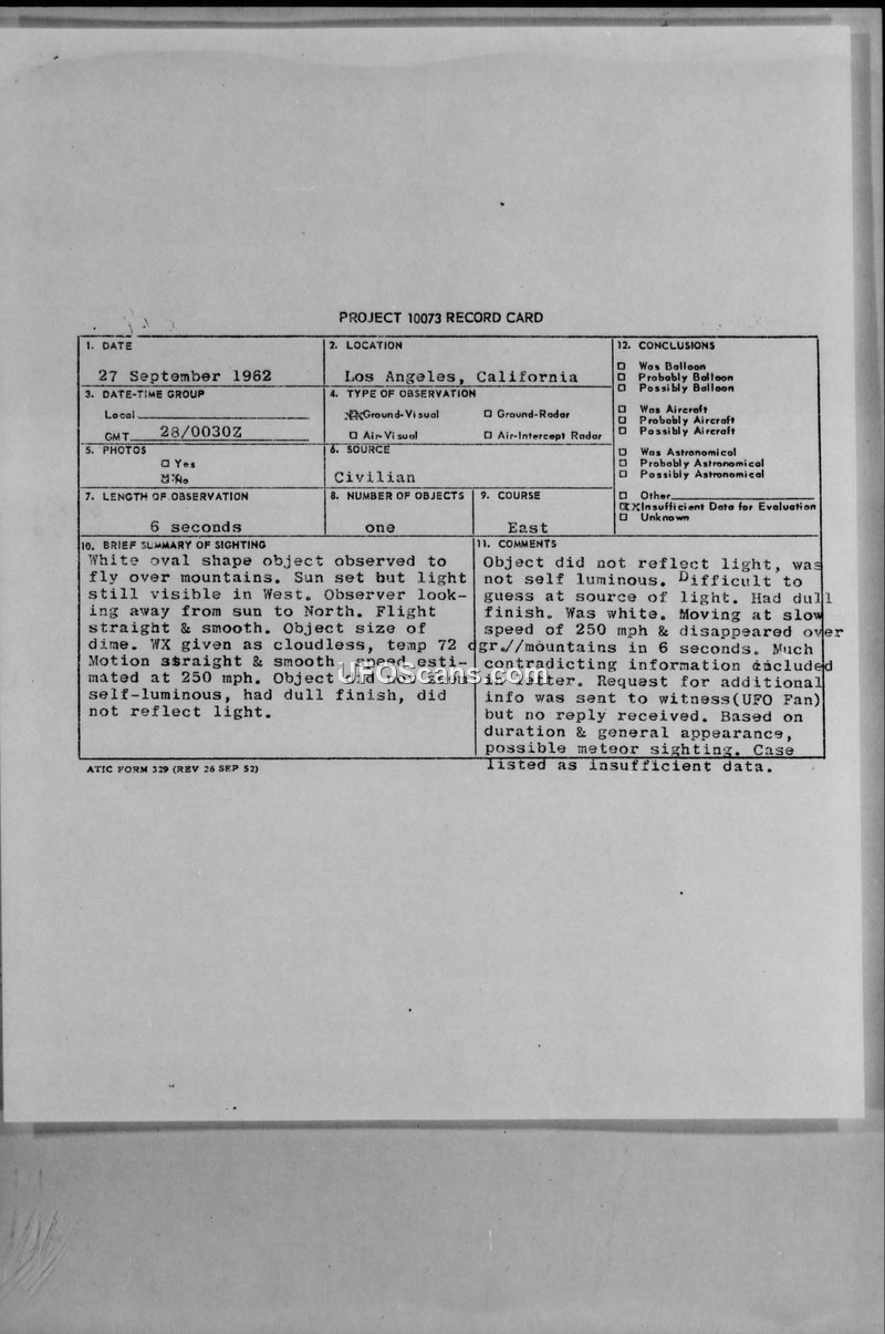 Project 10073 Record Card and Correspondence — Los Angeles, California, 27 September 1962