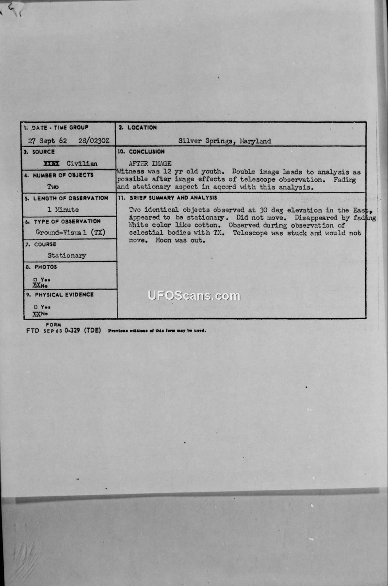 UFO Sighting Report — Silver Spring, Maryland, September 1962