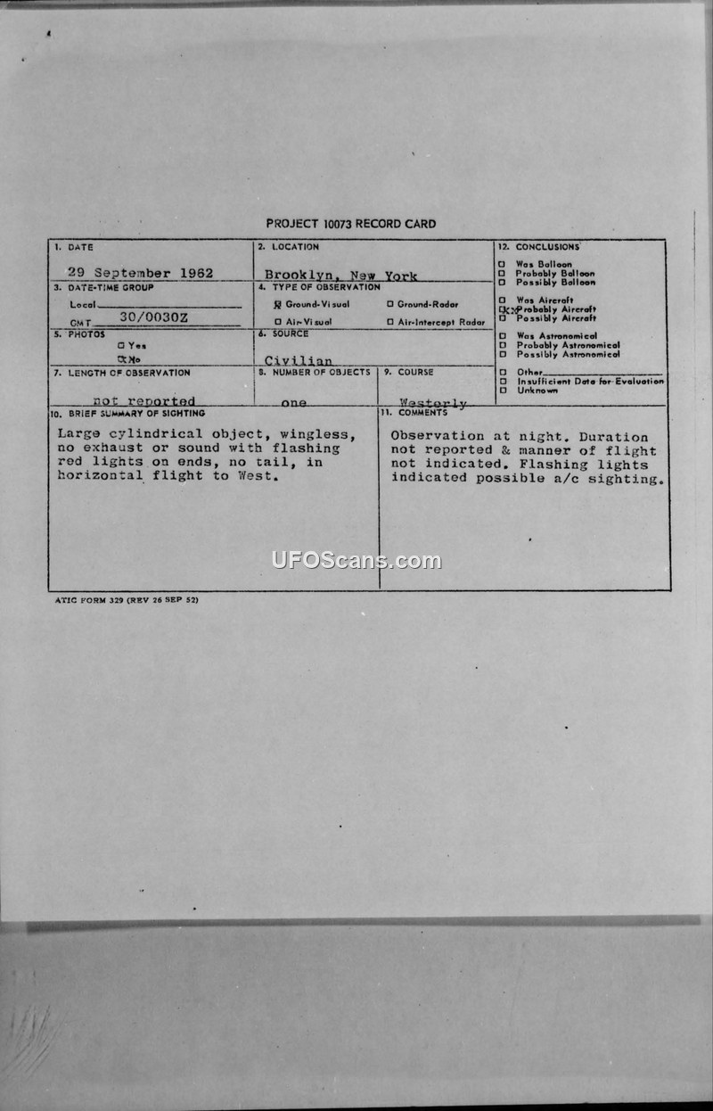A 17-year-old witness in Brooklyn reported a slow-moving, cylindrical, wingless object at 2,000 feet on 29 September 1962. The Air Force concluded the sighting was likely an aircraft due to the presence of flashing lights.