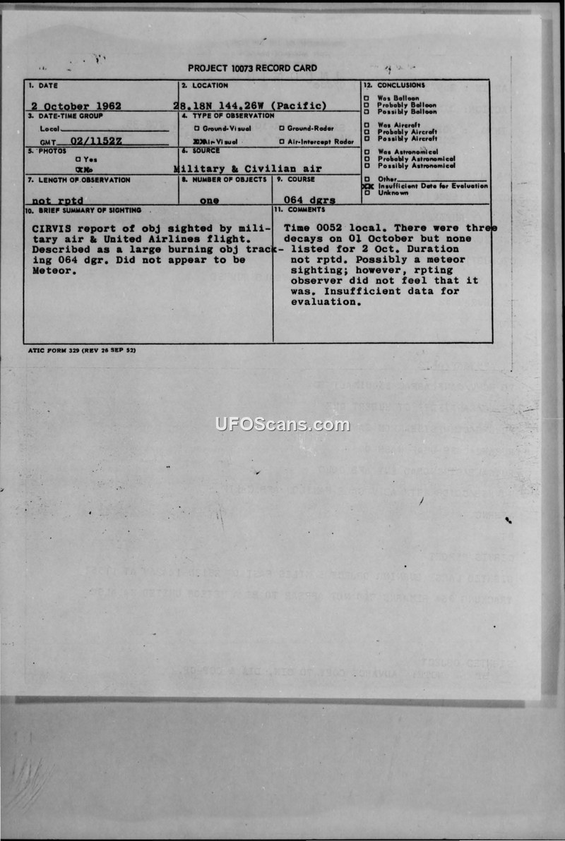 A CIRVIS report from October 2, 1962, documents a large burning object sighted by military and United Airlines aircraft in the Pacific. The Air Force concluded there was insufficient data for evaluation.