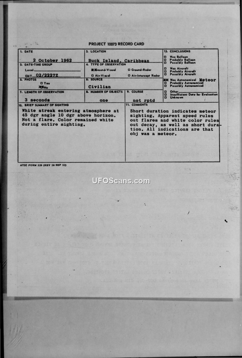 On October 2, 1962, at 2227Z, a civilian witness reported observing an unidentified object near Buck Island in the Caribbean. The witness described seeing a white streak entering the atmosphere at a 45-degree angle, approximately 10 degrees above the horizon. The observation lasted for approximately three seconds. The witness explicitly noted that the object was not a flare and that the color remained white throughout the duration of the sighting. The report was initially received by the FAA Flight Service Station in St. Croix, Virgin Islands, and subsequently transmitted via a CIRVIS (Communication Instructions for Reporting Vital Intelligence Sightings) message to various military commands, including COMCARIBSEAFRON, CINCNORAD, and the 72nd Bomb Wing at Ramey Air Force Base. The Air Technical Intelligence Center (ATIC) evaluated the report under Project 10073. Based on the short duration of the event, the white color, and the apparent speed of the object, the official conclusion reached by the investigators was that the object was a meteor.