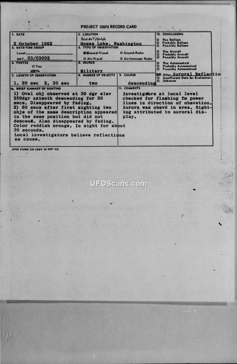 Project 10073 Record Card — Moses Lake, Washington, 2 October 1962