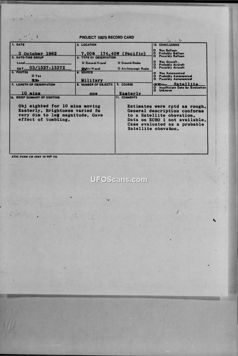 A 1962 military sighting report from the Pacific region describes an object moving easterly for 10 minutes. The object was officially evaluated as a probable satellite.