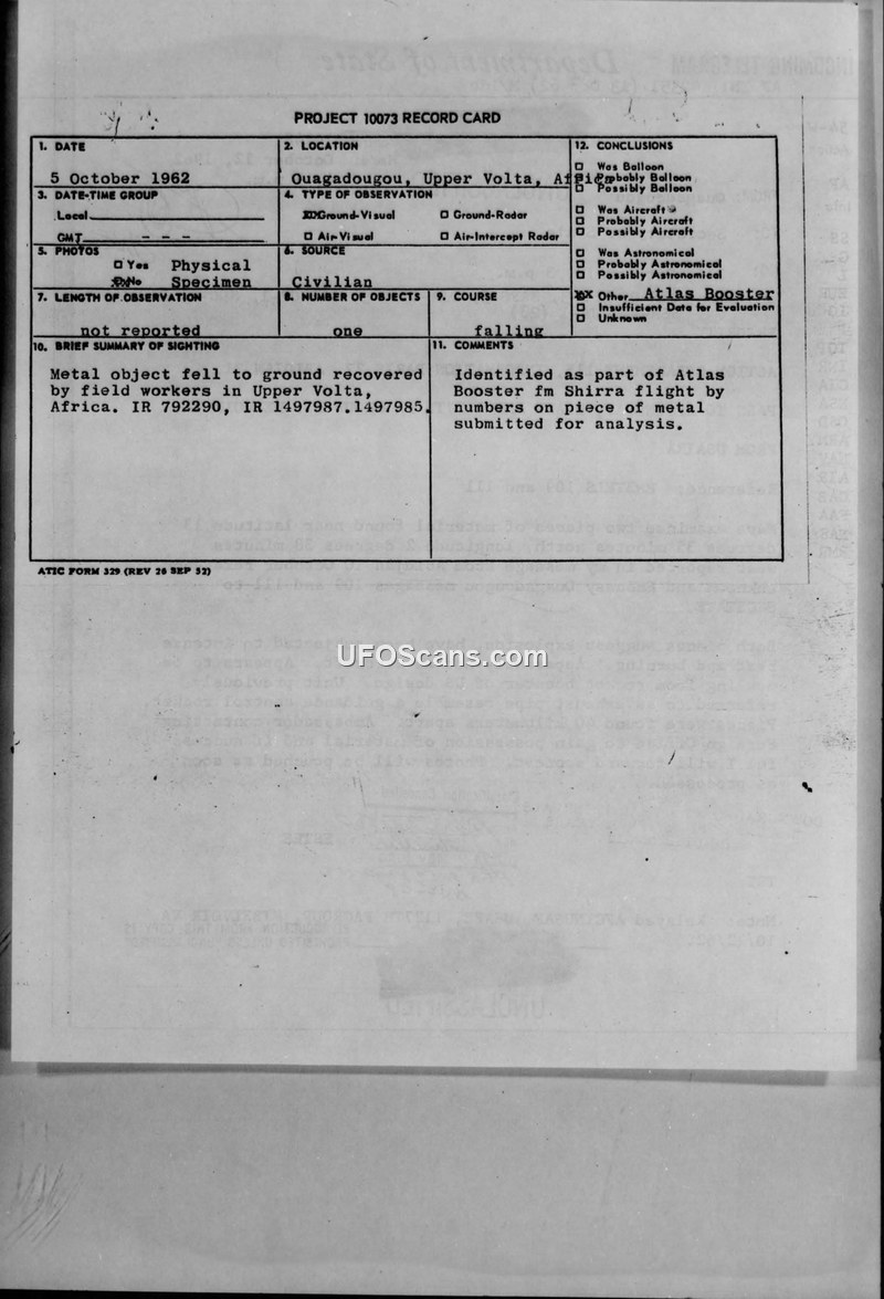 This document consists of a Project 10073 record card and an associated Department of State incoming telegram dated October 12, 1962. The records detail the recovery of metal debris in Upper Volta, Africa, following a reported falling object incident on October 5, 1962. Field workers in the region recovered the material, which was subsequently analyzed. The investigation determined that the object was not an aircraft or an unidentified aerial phenomenon, but rather debris from a US-designed Atlas booster associated with the 'Shirra' flight. The telegram notes that two pieces of material were found approximately 40 kilometers apart near the coordinates 13 degrees 35 minutes north, 2 degrees 38 minutes west. The recovered items exhibited signs of intense heat and burning, leading investigators to conclude that the booster had experienced an explosion. The US Embassy in Ouagadougou coordinated with the local Foreign Office to secure the material for further analysis. The document was originally classified but had its classification cancelled by May 1969.
