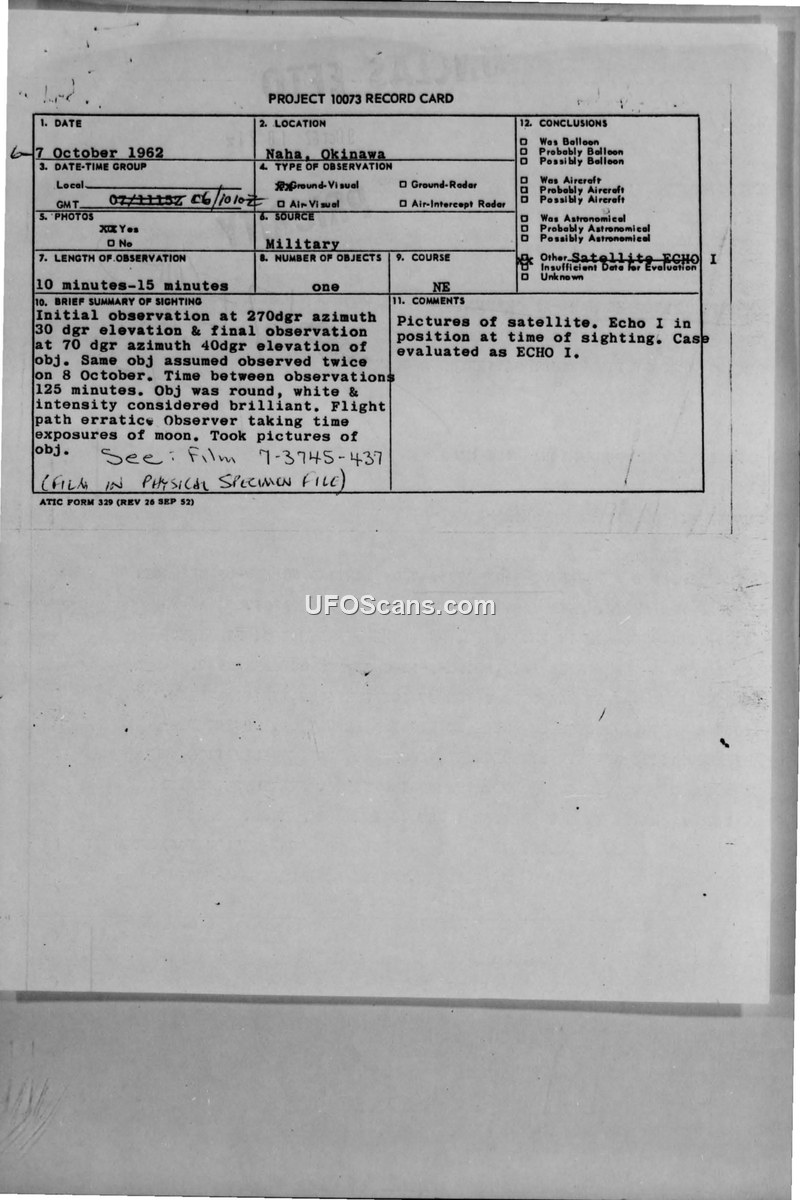 Military personnel in Okinawa reported sightings of an erratic, brilliant white object in October 1962. The object was tentatively identified as the Echo I satellite, and photographic evidence was submitted for analysis.