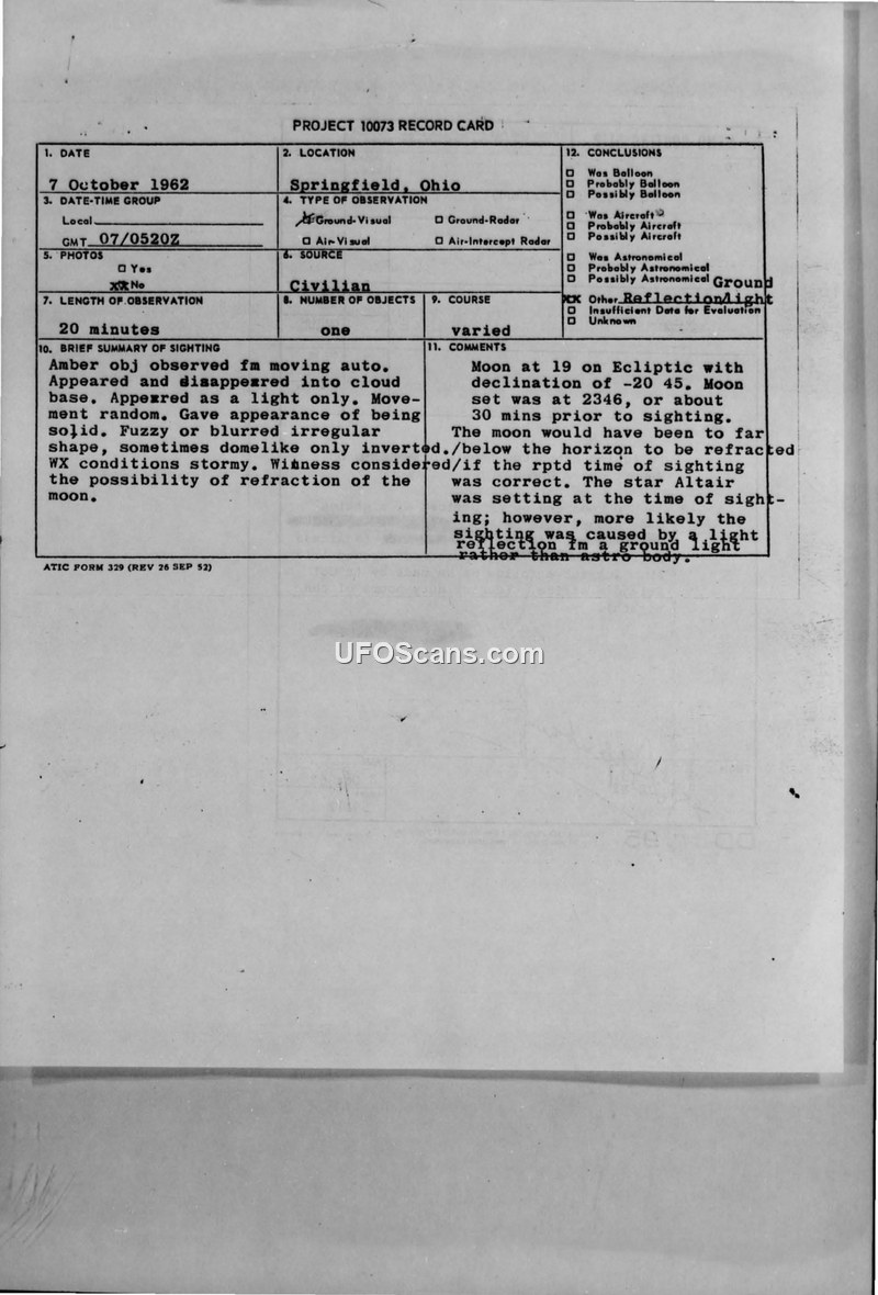 Project 10073 Record Card — Springfield, Ohio, 7 October 1962