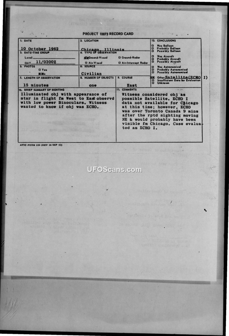 This document contains two Project 10073 record cards and associated correspondence from the 64th Troop Carrier Squadron regarding unidentified flying objects reported over Chicago, Illinois, in October 1962. The first incident, occurring on 10 October 1962, involved a witness observing an illuminated object with the appearance of a star moving from west to east for approximately 15 minutes. The witness used low-power binoculars and suspected the object might be a satellite. Air Force evaluation concluded the object was the ECHO I satellite, noting that while data was not immediately available for Chicago, the satellite's trajectory over Toronto shortly after the sighting made it likely visible from Chicago. The second incident, reported on 18 October 1962, involved two boys, aged 14 and 12, who observed a luminous, cigar-shaped object moving from east to west below the height of two jets. The observation lasted 23 seconds, and the altitude could not be determined. The official conclusion for this second case was that there was insufficient data for a definitive evaluation.
