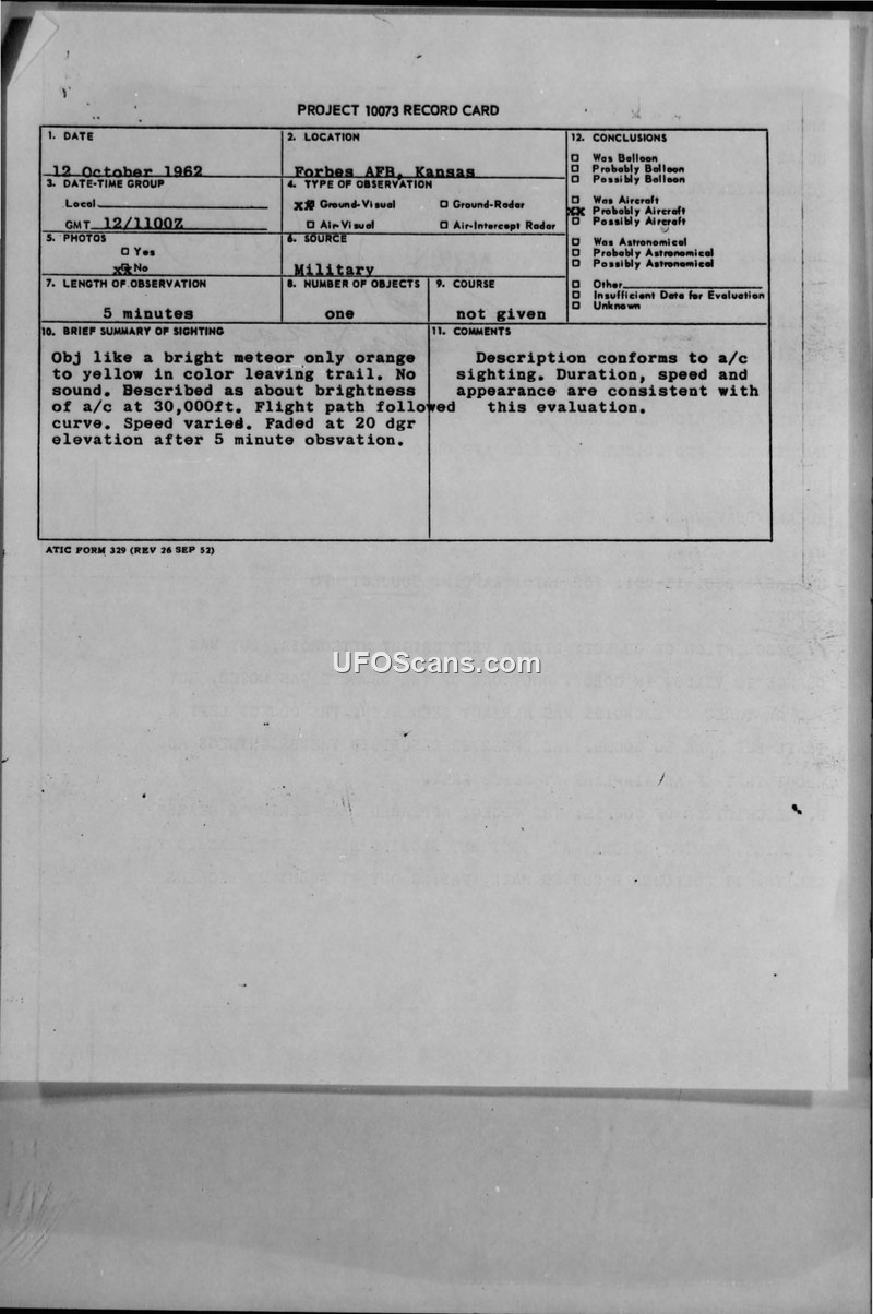 On 12 October 1962, at approximately 1100Z, an airman named TR Maynard observed an unidentified object at Forbes Air Force Base in Kansas. The object was described as a bright, orange-to-yellow light leaving a trail, with no audible sound. The witness estimated the brightness to be comparable to an aircraft at 30,000 feet. The object appeared from behind a nearby building, moved quickly, then slowed as it reached the zenith, following a curved path before fading out at 20 degrees elevation after a five-minute duration. The observer noted that the object jerked slightly in its flight path on occasion. The report, prepared by 2/LT John K. Hord of the 42nd Bomb Wing, notes that other meteoroids had been sighted in the area, leading to the conclusion that the object was likely an unusually bright meteoroid. The report suggests that the observer's perception of time and the object's color may have been influenced by chemical properties of the meteor or memory magnification. Weather conditions at the time included scattered clouds at 10,000 feet and 9-mile visibility, with no thunderstorms reported.