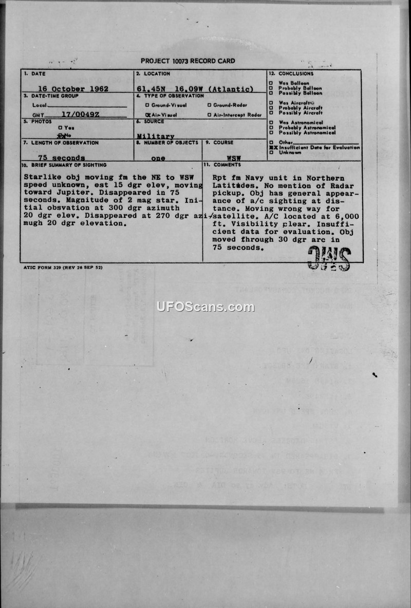 A Navy unit reported a starlike UFO in the North Atlantic on October 16, 1962. NAVSPASUR confirmed no known satellites were in the area, and the Air Force concluded there was insufficient data for evaluation.