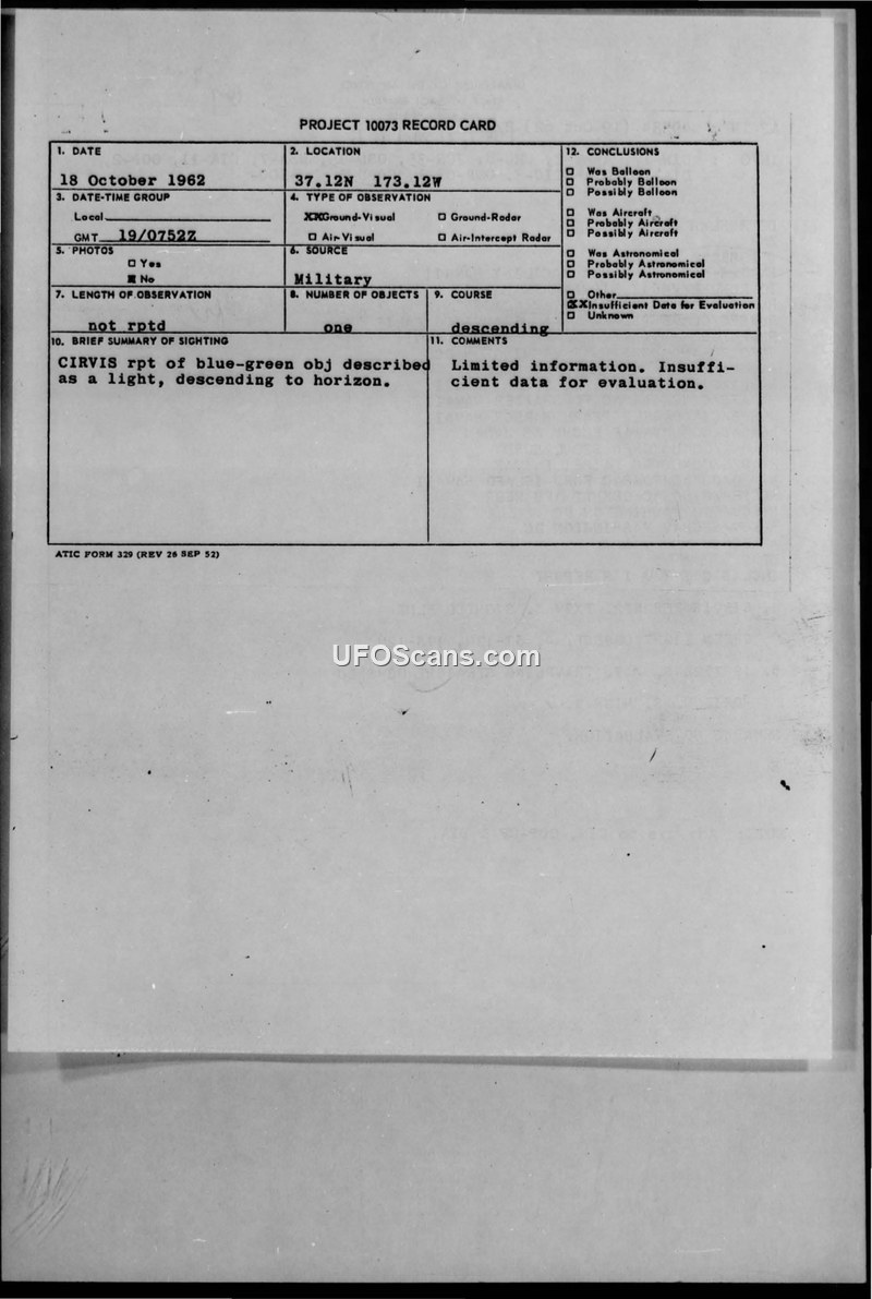 A 1962 Project 10073 record card details a visual sighting of a blue-green light descending to the horizon at 37.12N 173.12W. The case was closed due to insufficient data.