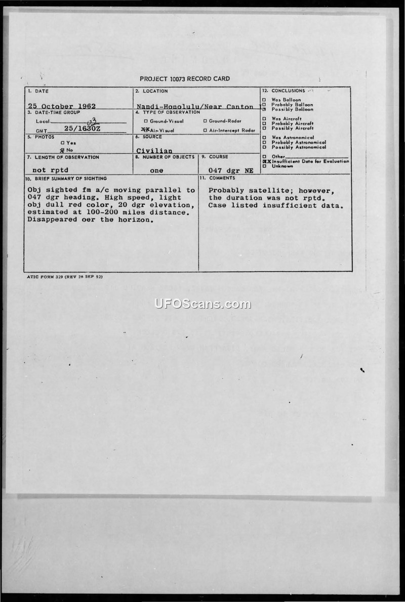 On October 25, 1962, at 1603Z, the pilots of Quantas flight 586 reported an unidentified aerial phenomenon while in the vicinity of Canton Island. The object was observed at a four o'clock position, described as a dull red light moving at high speed on a 047-degree heading. The pilots estimated the object's elevation at 20 degrees and its distance between 100 and 200 miles. The object eventually disappeared over the horizon. The incident was reported through military channels, specifically via the 326 Air Division at the Kunia Facility in Hawaii, to various military commands including CINCPAC and CINCNORAD. The official Project 10073 record card notes that while the object was likely a satellite, the lack of reported duration data resulted in the case being officially categorized as having insufficient data for evaluation.