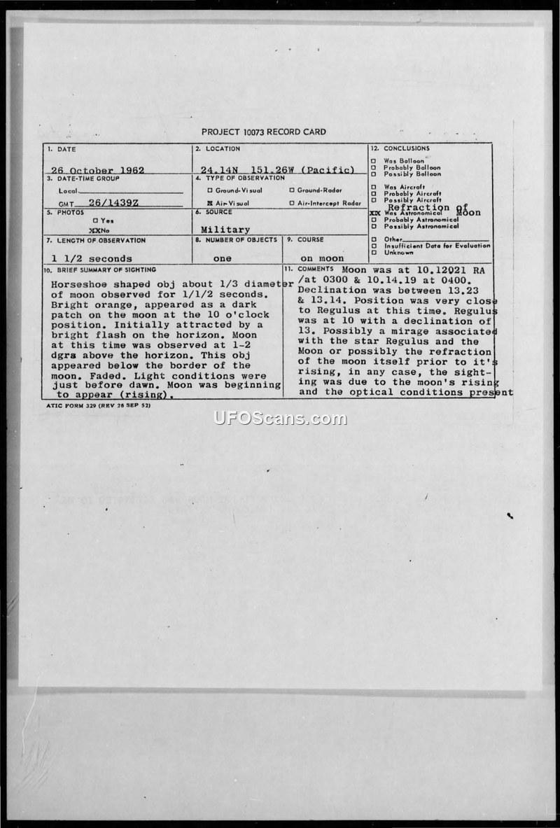 On 26 October 1962, at 1439Z, the crew of a KC-135 aircraft (identification number Diana 85) observed an unidentified aerial phenomenon while flying over the Pacific at 24.14N 151.26W. The aircraft was at an altitude of 35,000 feet, heading 054 degrees true. The observers, identified as Colonel Holly Anderson and Major A. E. Casperson, reported seeing a bright orange, horseshoe-shaped object for approximately 1.5 seconds. The object was estimated to be one-third the diameter of the moon. The sighting began when the observers noticed a bright flash on the horizon, followed by the appearance of the object just below the border of the moon, which was in a crescent shape and positioned 1-2 degrees above the horizon. A dark patch was noted on the moon at the 10 o'clock position. The object did not move and eventually faded out. The navigator attempted to use a sextant to track the object, but it had already disappeared. The official conclusion reached by the project evaluators was that the sighting was likely an astronomical phenomenon, possibly a mirage associated with the star Regulus or atmospheric refraction of the moon as it was rising.