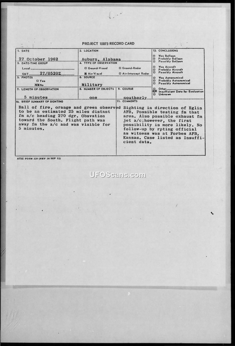 Project 10073 Record Card — Auburn, Alabama, 27 October 1962