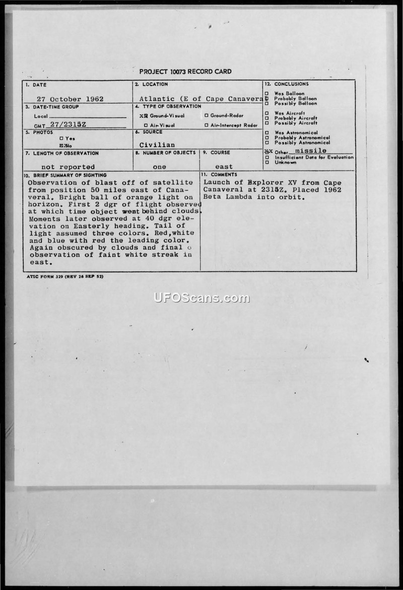 Project 10073 Record Card: Sighting of Explorer XV Launch, 27 October 1962